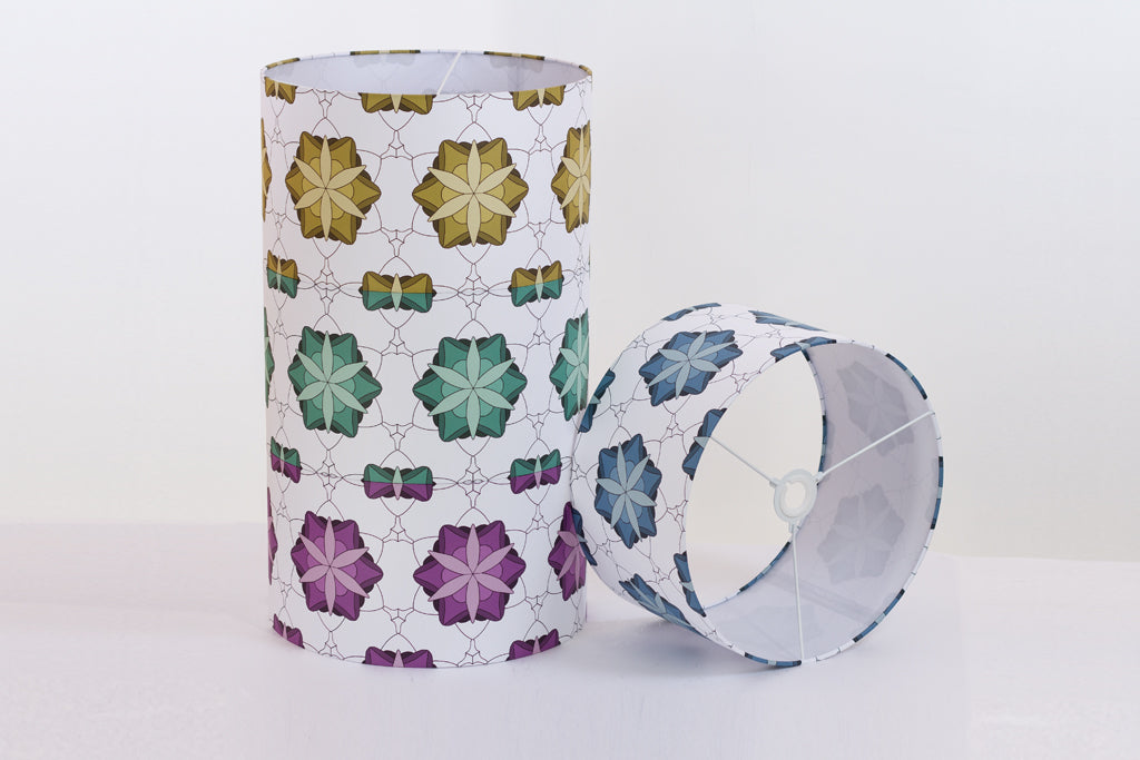 This printed paper lampshade collection features various geometric designs. All designed and printed by imbue Lighting