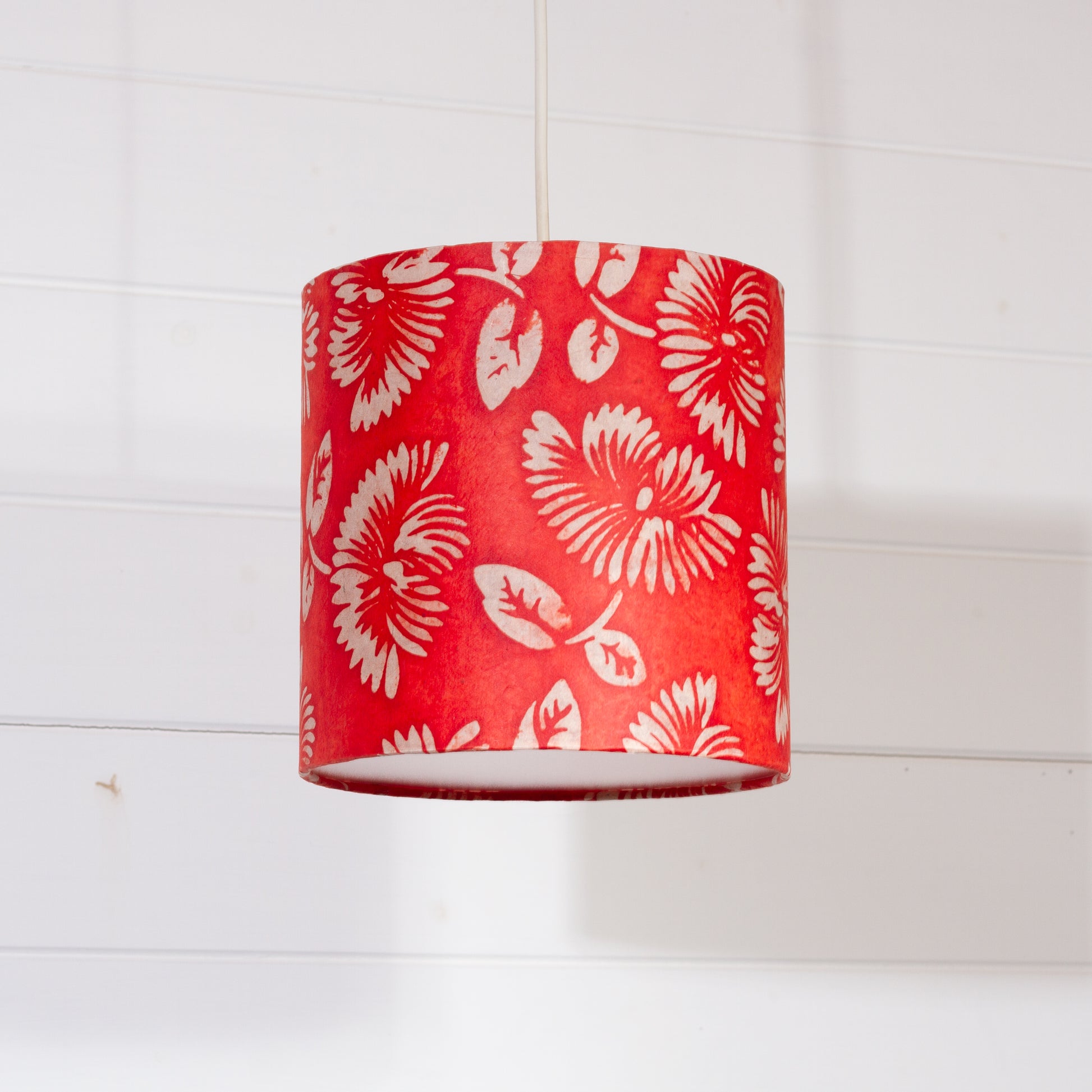 Our Batik Peony Red design is made by stamping a wax pattern of a peony using a wooden block on to natural lokta paper. Once the wax is dry the paper is then dyed using a stunning Red dye. It is then dried in the shade, Once dry it is ready to be made into a Lamp Shade. We import this paper from Nepal.
